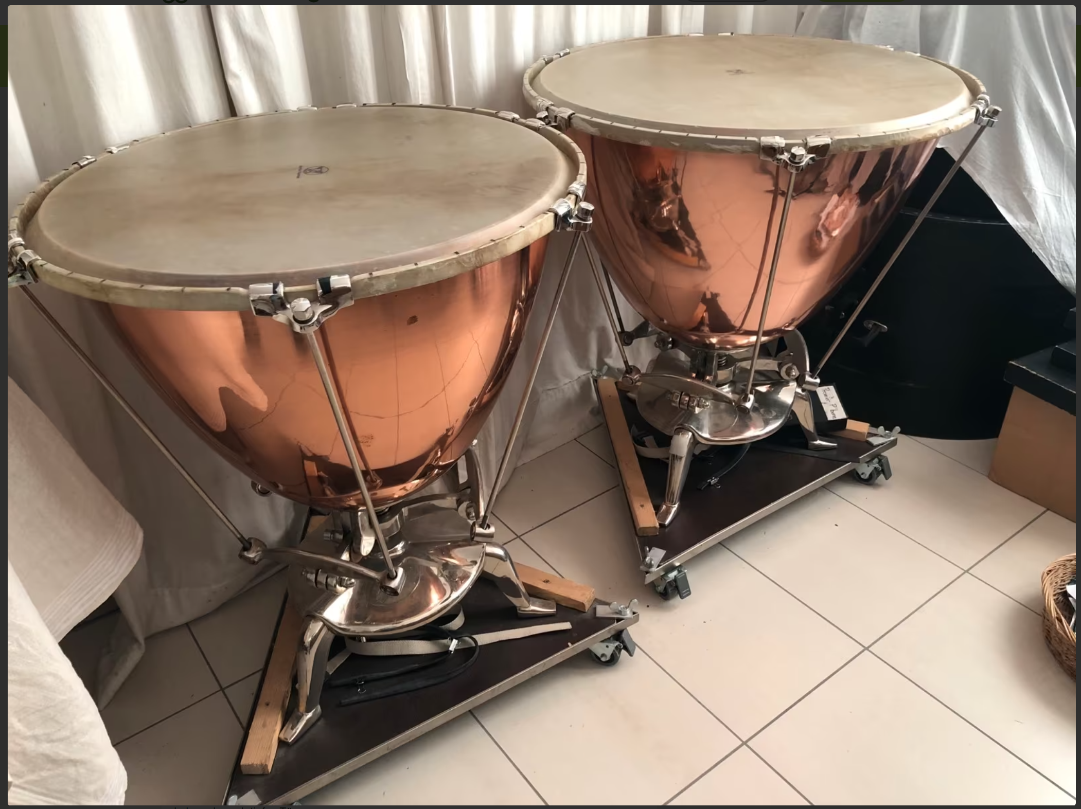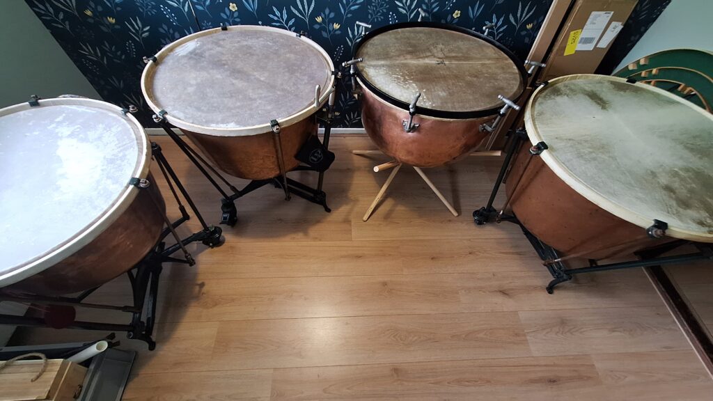 Heel soms, komt er een gouden kans voorbij. Voor mij enorm passend is dit stel 23″ en 26″ draaipauken. Gemaakt door Adams als onderdeel van hun Schnellar lijn. Het concertgebouw heeft deze gebruikt tijdens een uitvoering van de Grande Messe des Morts, waarvoor vele pauken benodigd zijn. Daar zijn ook twee sets draaipauken gemaakt. Een set is later bij Marinus Komst gekomen, de tweede set is in de showroom van Adams opgevallen aan degene die ze mij heeft verkocht, dit is sinds november 2025.